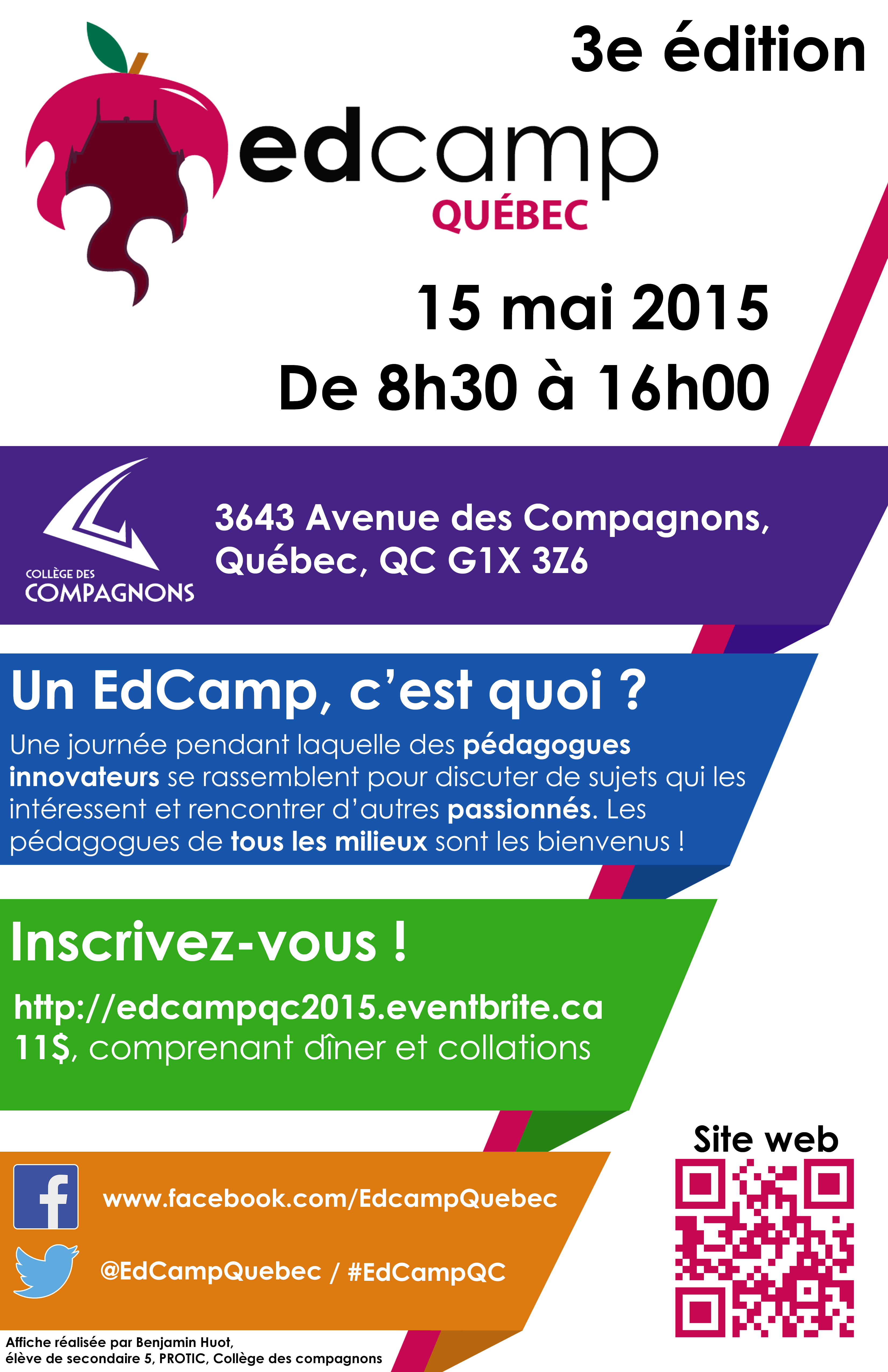 La voici! Créée cette année par Benjamin Huot, élève de 5e secondaire au programme PROTIC du Collège des Compagnons. Utilisez-la pour inviter vos collègues à se joindre à vous pour cette journée toujours mémorable! Inscription ici : http://edcampqc2015.eventbrite.ca